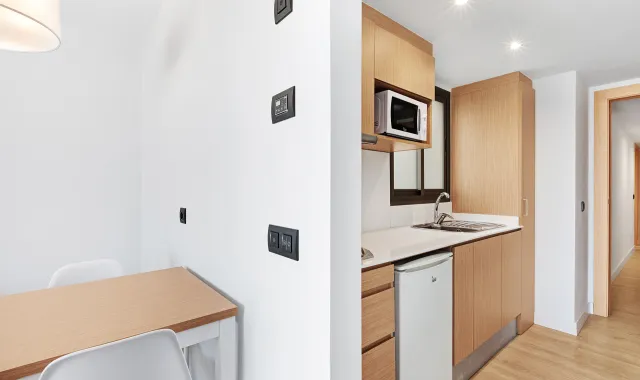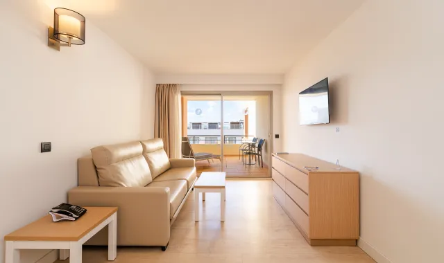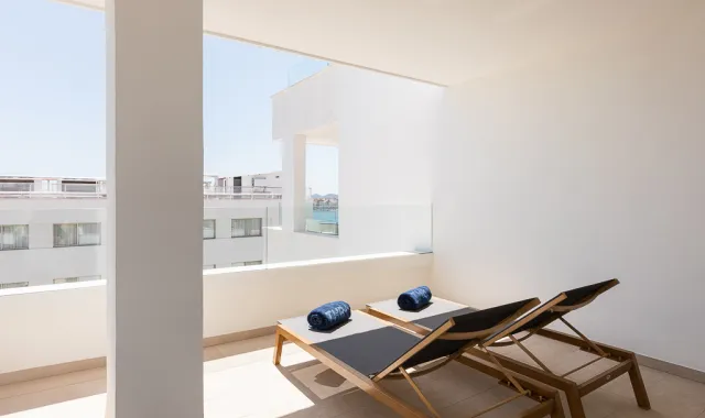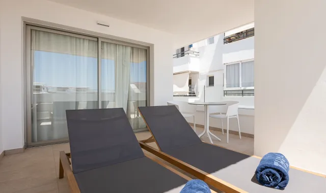 Nuestros apartamentos de 40m², cuentan con un dormitorio, sala de estar y cocina, todo lo que necesitas para disfrutar de tu estancia en Ibiza. Además, el balcón con hamacas es el lugar perfecto para relajarte.